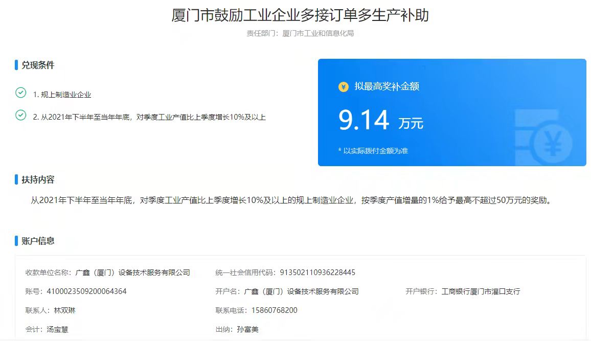 结合本次厦门市政府的表彰激励政策,广鑫集团旗下的广鑫(厦门)钢绳索具有限公司和广鑫(厦门)设备技术服务公司均符合及达到表彰条件。同时广鑫(厦门)设备技术服务公司的业绩增幅位列榜上前茅。