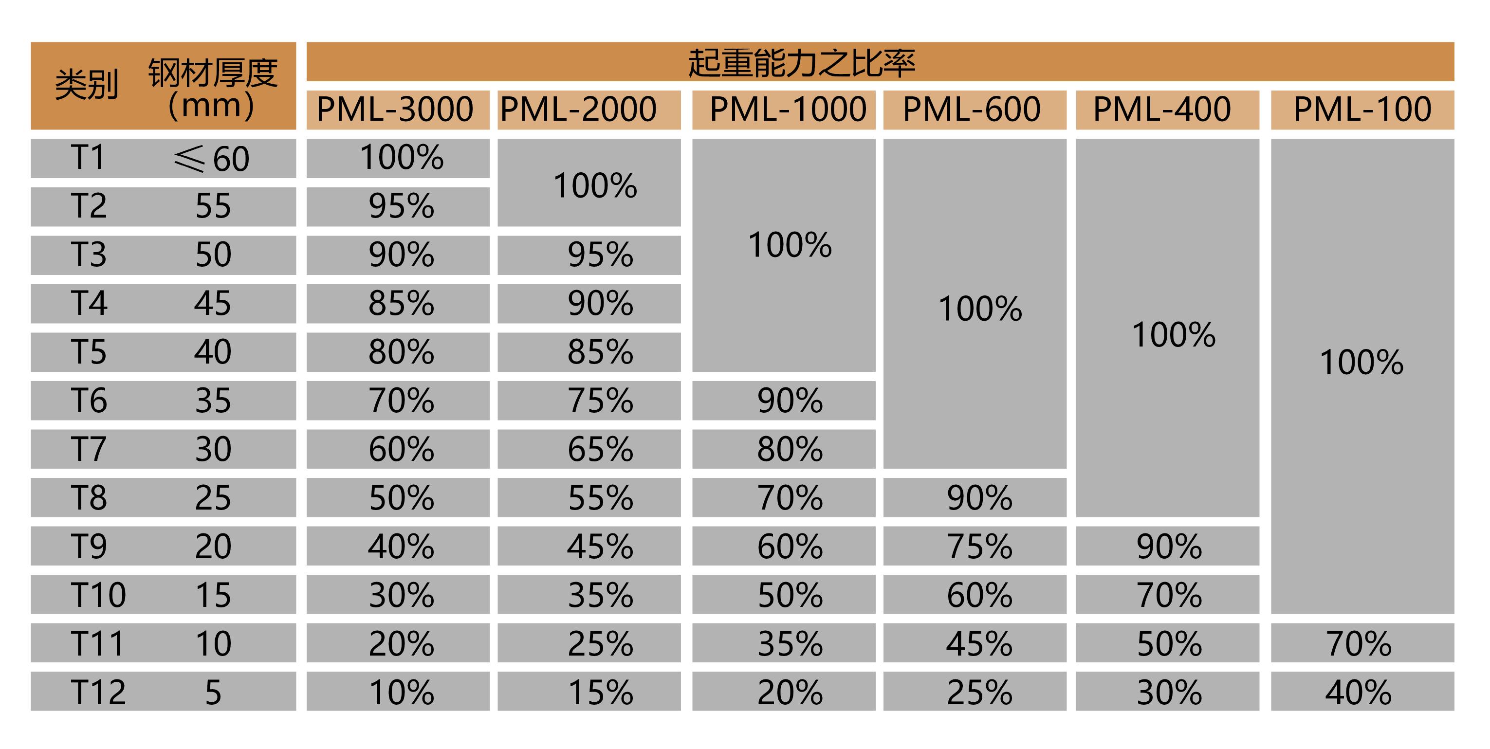 例:钢板条件为T8、F1及M2,型号PML-600永磁起重器极限工作载荷为600kg,吊运此钢板的实际起重能力如下: