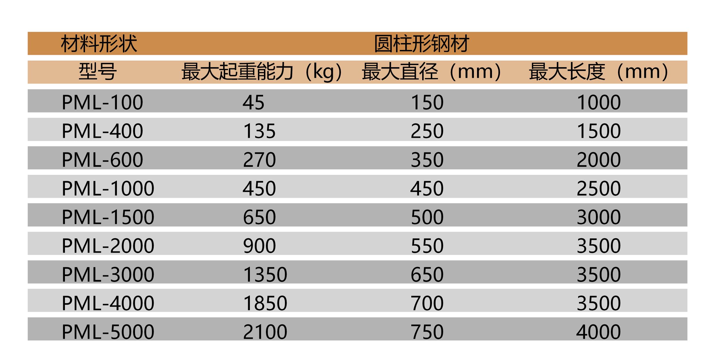 3)吊运圆柱形工件时,应将永磁起重器底部的V字型槽与圆柱形工件表面接触,但起吊能力一般为实际工作载荷的30%—50%,下表数值作为参考。