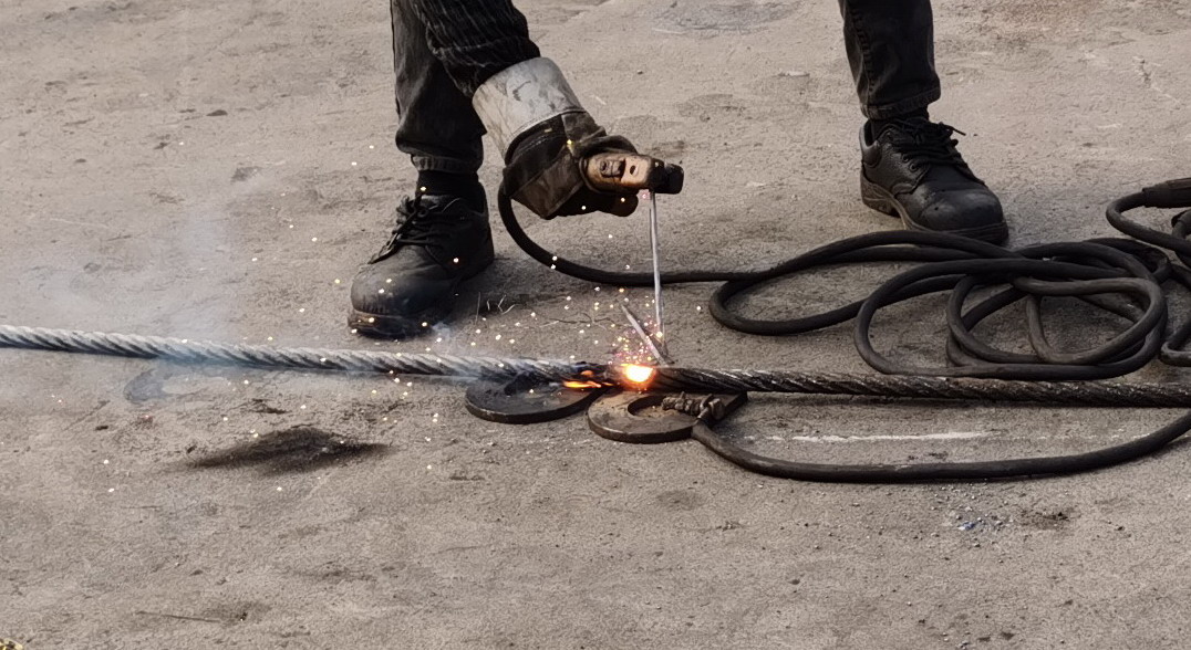 1) 使用旧绳牵引新绳安装过程中,如果旧绳与新绳之间采用焊接等方式刚性连接(图3),旧绳上残留的部分扭转应力将传递到新绳上,可能引起扭转应力累积,最终造成吊钩旋转。