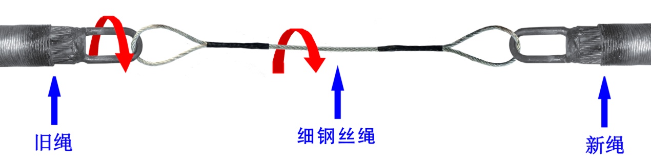 为了确保旧绳上残留的扭转应力不会转移到新绳上,可以通过使用辅助绳索吸收扭转应力,即在旧绳与新绳之间连接一根足够强度的细钢丝绳(图4)。