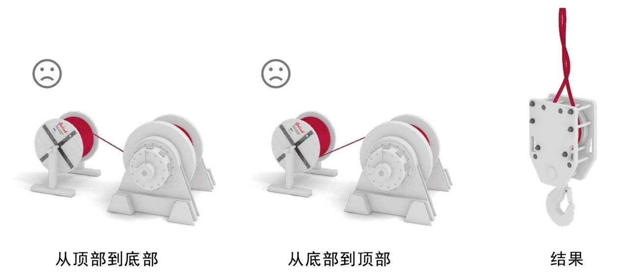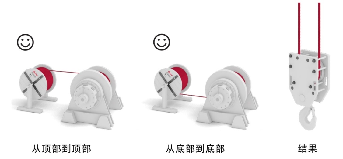 钢丝绳从卷盘到卷筒正确的绕绳方式应为正向弯曲进入,即从顶部到顶部或从底部到底部的绕绳方式(图6)。