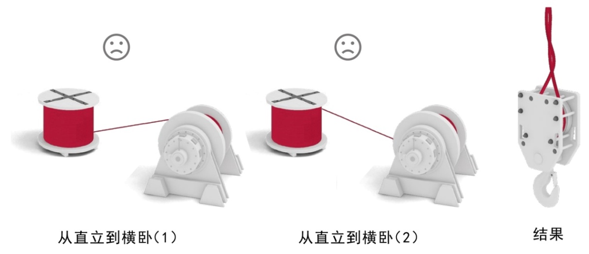 2) 钢丝绳从卷盘到卷筒使用不正确的绕绳方式,例如反向弯曲(图5)、从直立到横卧(图6)等方式,这将带入扭转应力,可能引起吊钩旋转。