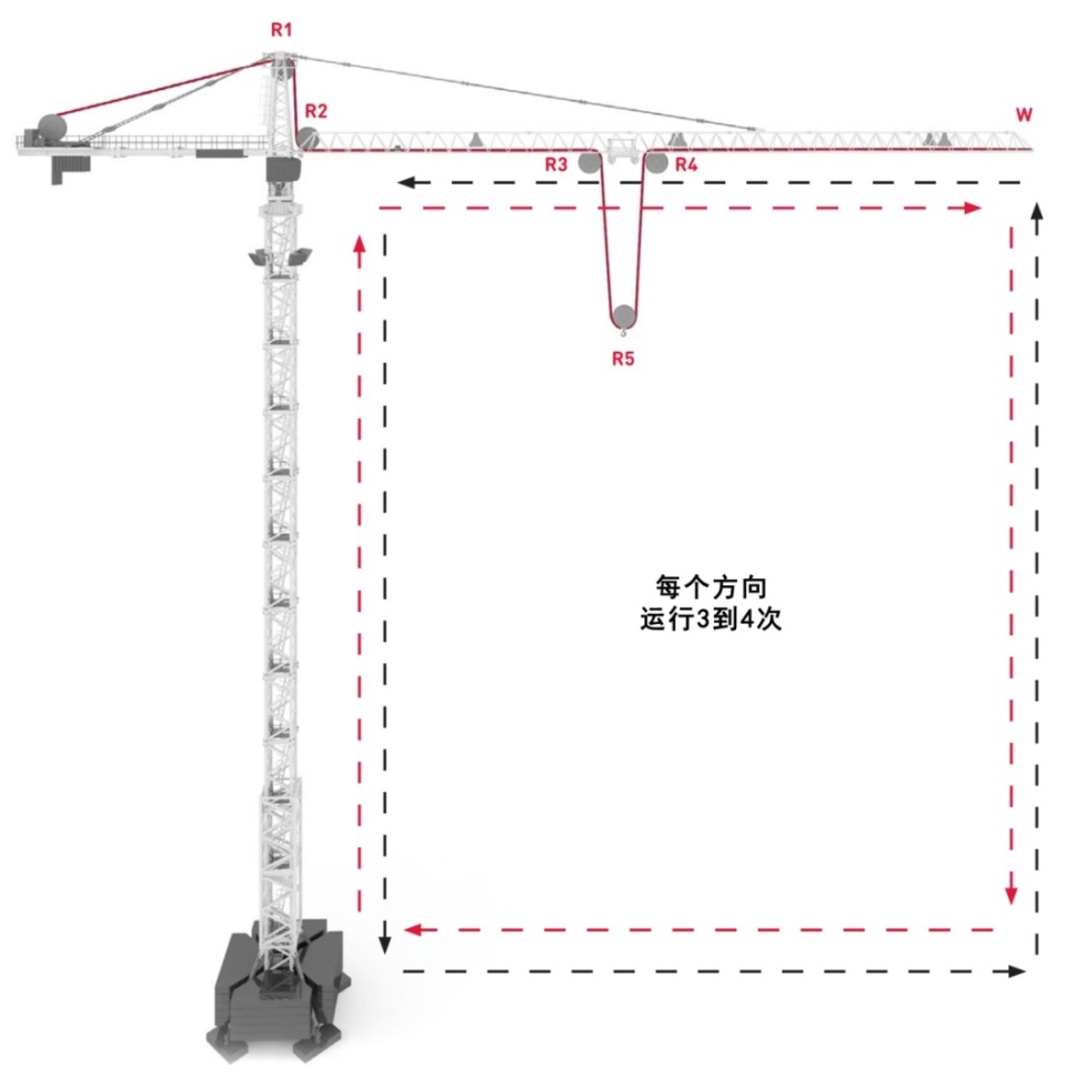 1. 操作塔吊小车与吊钩运行,如图2所示,先按黑色虚线及箭头方向循环操作3~4次,再按红色虚线及箭头方向循环操作3~4次,可以将钢丝绳上部分扭转应力转移至旋转器(W)上,从而解决吊钩旋转问题。