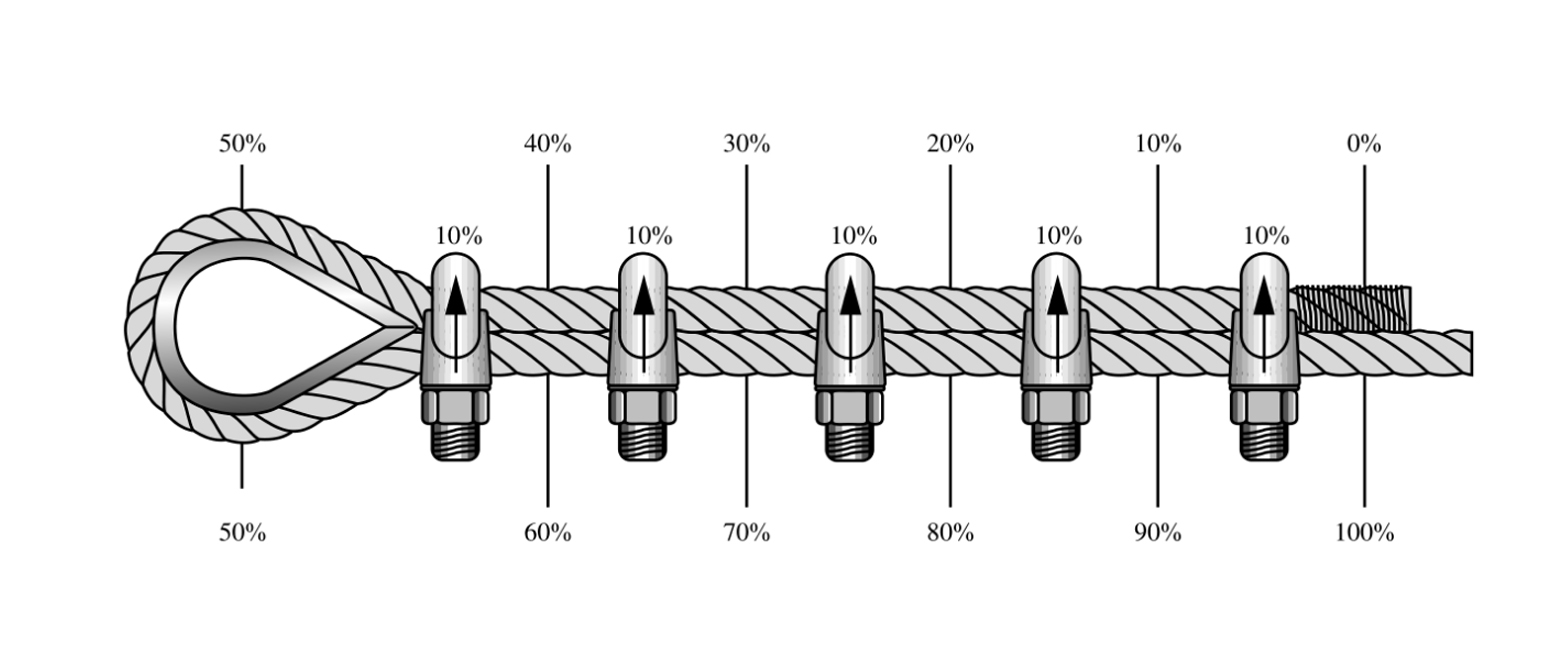 在每一个绳夹处,大约相同的拉力从“工作段”转移到“尾段”上。如果以5个绳夹固定为例,每一个绳夹大约传递10%的拉力。因此,开始时主绳要承受100%的拉力。在每个绳夹处,它将10%的拉力传递到 “尾段”绳索上。在套环处的钢丝绳拉力将被精确地减少到50%(图4)。