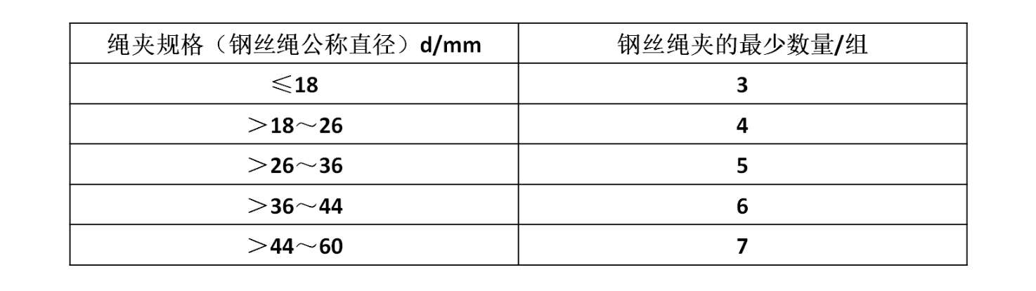 正确的使用绳夹数量,正确布置与夹紧,固定处的强度至少为钢丝绳自身强度的80%。