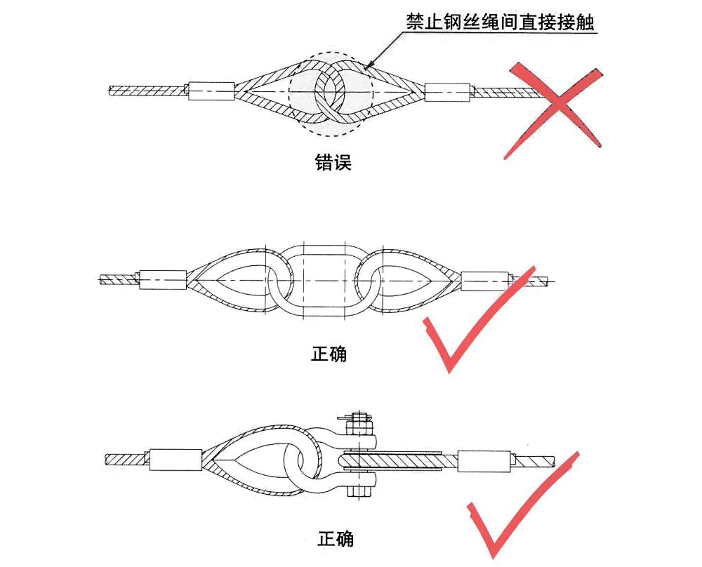 5、钢丝绳索具禁止打结,止钢丝绳间直接接触,应加卸扣成吊环隔开。(以压制钢丝绳索具为例,插编钢丝绳索具同理)